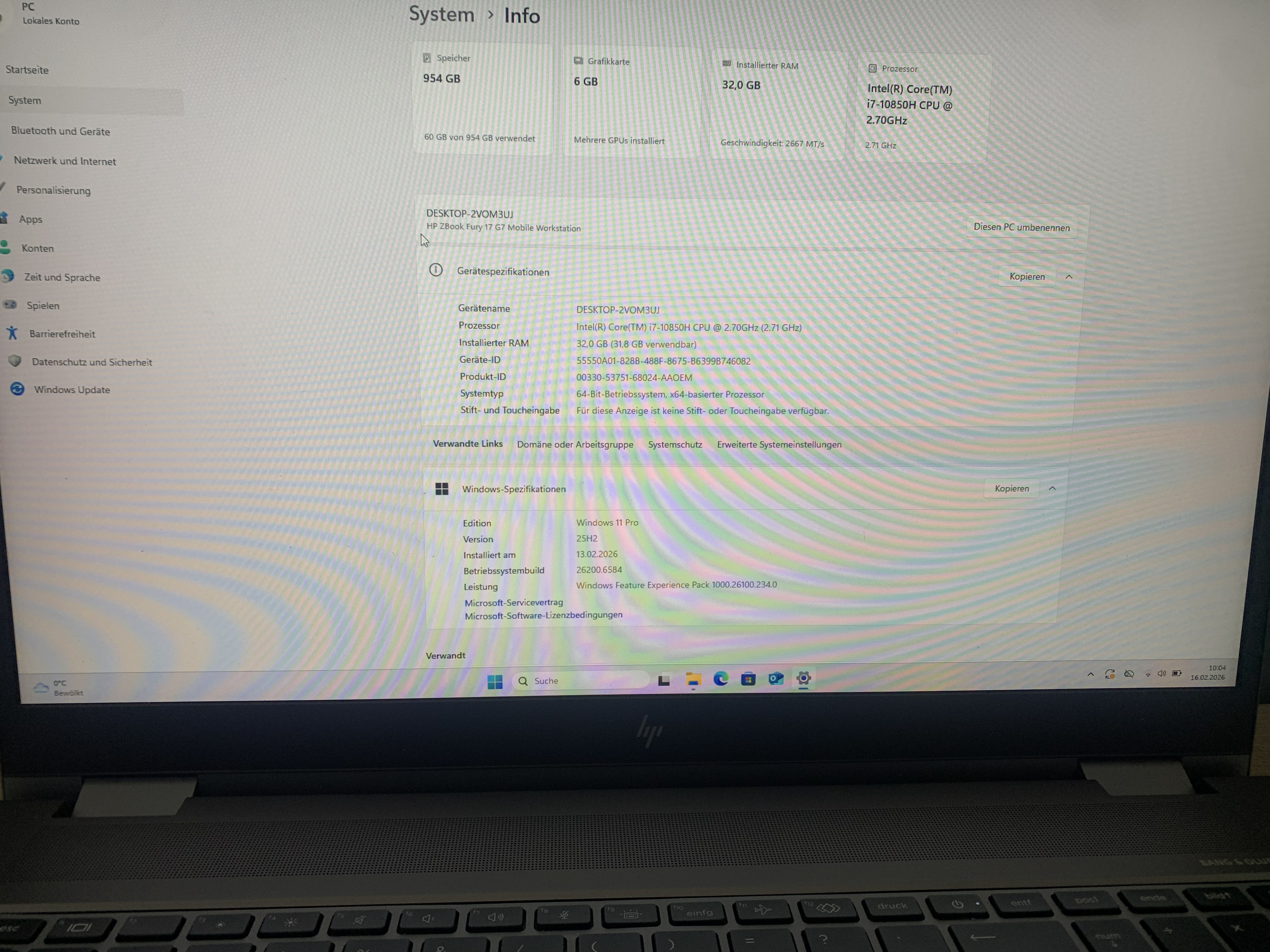 | Prozessor | Intel Core i7-10850H (6× 2,70 GHz, Turbo) vPro |