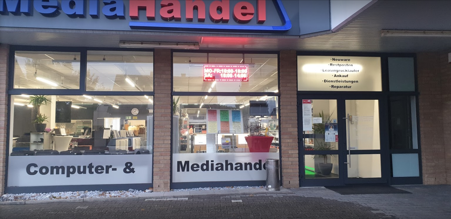 Computer- & Mediahandel steht nun seit über 20 Jahren für günstige Computer- & Unterhaltungstechnik, sowie allem was damit zu tun hat. Wir halten ständig ein großes Sortiment an neuer Ware, Restposten und gebrauchter Ware zu günstigen Preisen für Sie bereit. Unser Bestand setzt sich aus Notebooks, PCs, TFTs, Workstations/Servern, Hard- und Software, Unterhaltungselektronik und Plottern zusammen. Umfangreiche Dienstleistungen: PC-Reparatur (günstige Pauschalpreise), Vor-Ort-Service, Firmenbetreuung, ISDN + DSL Einrichtung, Virusprüfung, Netzwerkpflege, PC-Aufrüstung, Leasing und Finanzierung, Inzahlungnahme/Ankauf, usw... Sie haben Geräte abzugeben? Gerne unterhalten wir uns über einen Ankauf mit Ihnen. Besuchen Sie uns auch in unserem Ladenlokal. Wir bieten eine ca. 1000m² große Verkaufsfläche mit einer Vielzahl von Angeboten, super Preisen und großem Service!!! Wir freuen uns auf Ihren Besuch.